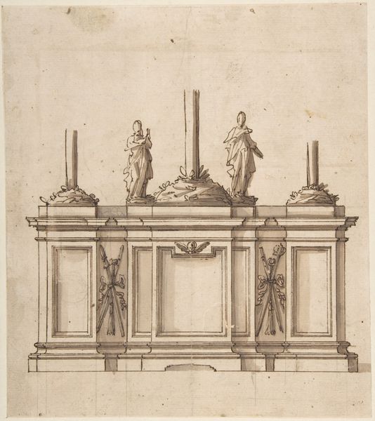 This drawing, "Design for a Double Tomb", of unknown date, and by an anonymous artist, presents a symmetrical, multi-tiered structure rendered in precise lines. The monochromatic palette emphasizes form and intricate detail. The design evokes a sense of solemn monumentality. Observe the careful balance of horizontal and vertical elements: from the reclining figures at the base to the praying figures at the very top. This symmetry imposes a sense of order and classical harmony, yet, within this framework, the artist introduces complex ornamentation. Shields, statues, and garlands decorate the tomb. These provide a visual richness that complicates the underlying structure. The tomb, with its elaborate display, confronts us with questions of representation and remembrance. How do we construct lasting symbols of identity and status? This drawing functions as more than a plan; it is an exploration of cultural values, expressed through architectural form.