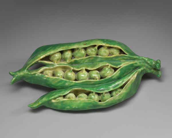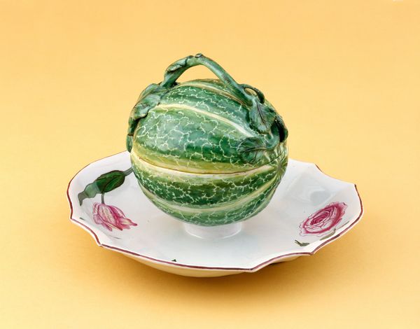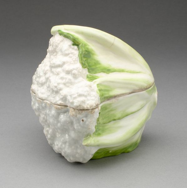 Curator: Here we have a rather curious piece. It's a ceramic tureen in the shape of a cabbage, created before 1754, and part of the Minneapolis Institute of Art's collection. What are your first thoughts? Editor: Absurdity and excess! It's flamboyant, isn't it? A cabbage rendered in such detail and presumably for a wealthy table. It speaks volumes about status. Curator: It does. Think of the cabbage itself as a humble vegetable, transformed into an elaborate display. The choice of porcelain elevates it to a luxury item, playing with ideas of value and worth. Cabbages have always been associated with more rustic and humble meals so to create something like this is quite clever. Editor: And the detail! Each leaf seems meticulously rendered. Is this anonymous artist attempting to mimic nature, or make some sort of social point, perhaps a nod toward the emerging role of gardens as display? Curator: I think it's both. On one hand, we see a mastery of the material, showing just how lifelike porcelain can be. But beyond that, I agree; it signals wealth, refinement, and perhaps even an understanding of nature itself, refigured for domestic use and viewing. The cultural importance of gardens and their bounty was increasing. This allowed new displays of luxury through gardening and table decor. Editor: Were such tureens popular? Was this a trend in 18th century dining? Curator: Absolutely. These “trompe-l’oeil” ceramics were highly fashionable, and quite competitive. Aristocrats were constantly competing in displaying wealth through the use of complex, and intriguing luxury objects. The skill involved in making these elevated not just dining, but the decorative arts in general. Editor: Fascinating! So this tureen represents the social and cultural theatre of the 18th century table, an edible centerpiece turned permanent artwork, and a demonstration of craft, luxury, and wealth. Curator: Precisely! A cabbage made immortal, reflecting social currents that would eventually give way to revolution and societal change. A glimpse of life before it all changed.