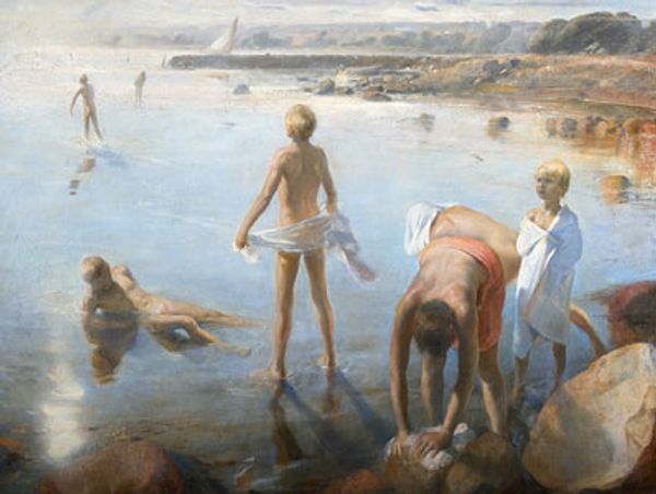 Editor: So, here we have Albert Edelfelt’s "Boys Playing on the Shore," painted in 1884. It's an oil painting depicting three boys by the water's edge, playing with boats. I’m struck by how simply it captures a carefree summer day. What do you see in this piece beyond its immediate charm? Curator: It's precisely that "carefree summer day" that I find so interesting. Edelfelt painted this during a period of intense nationalism in Finland. How does this idyllic scene, these blond-haired children engaged in play, serve the cultural narrative of Finnish identity at the time? Editor: That's a perspective I hadn't considered. It's not just a charming scene, it’s subtly shaping a national image. Curator: Exactly. Consider the location – a shoreline. Shores are boundaries and points of connection. Are these children representing a harmonious relationship with their natural landscape, solidifying a sense of belonging and ownership of the territory? Are their games also subtle training? Editor: It’s fascinating how the innocent play now has another significance. Is the portrayal of the children significant to the nationalistic sentiment? Curator: Absolutely. In much 19th-century art, children symbolize the future. Depicting them as healthy, robust, and connected to the land is a powerful statement about the nation's future prospects and the purity of its heritage. How are we, as a contemporary audience, implicated in this continued narrative, shaped through art? Editor: It’s given me a lot to think about – how art can function on multiple levels, reflecting and shaping cultural and political landscapes. I'll definitely be approaching similar works with a more critical eye in the future. Curator: Wonderful. Hopefully it will show us that things aren’t always as they seem, and this view shapes all the other work you may see.