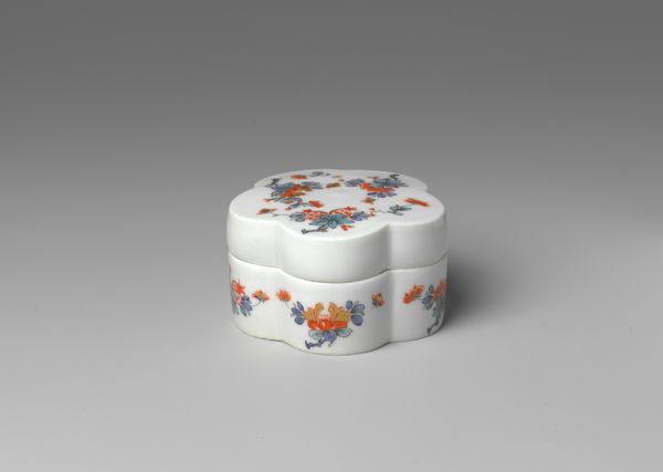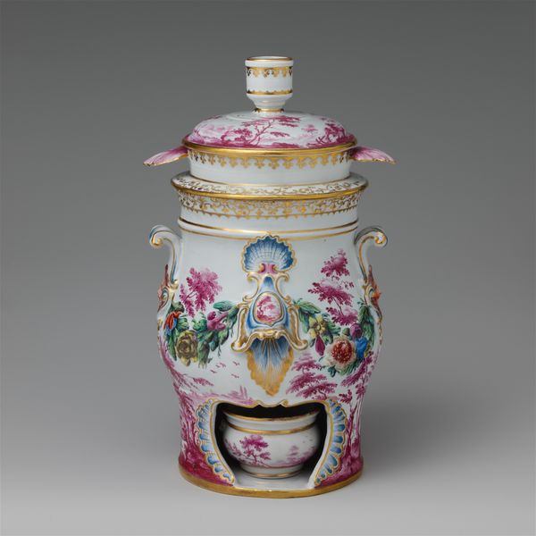 Curator: This enameled ceramic tea caddy, created by the Battersea Enamel Factory around 1755, offers a glimpse into the Rococo aesthetic of 18th-century England. Editor: It's delightfully ornamental, isn’t it? The pastel blue and the gold filigree evoke a very particular kind of refined elegance...almost excessively so. Curator: Precisely! Think of the ritual of tea drinking and its association with high society. Tea, in that era, was not merely a beverage but a symbol of status, social grace, and global trade networks. Editor: The composition strikes me as fascinating. Note the vertical stripes—seemingly straightforward but disrupted by curvilinear motifs, floral swags, and that elaborate cartouche. The push and pull creates a controlled visual tension. Curator: Absolutely, these floral motifs themselves were rife with symbolic weight. Roses for love, tulips for fleeting beauty...even the particular arrangement would communicate unspoken messages to a discerning audience. Editor: That reminds me; the enamelwork allows for incredible precision. Look at the gradient shifts in colour to shape the tulip. But tell me more: do you read specific cultural undercurrents embedded here beyond the status of tea? Curator: One can see traces of Chinoiserie—the Western interpretation and imitation of Chinese artistic styles. The cloud-like motifs near the top certainly hint at it. But fundamentally, this object embodies an English appropriation and reinterpretation of global aesthetics to create its own unique, mannered style. Editor: So it functions as an emblem of cultural hybridity. Thinking of it purely formally again, there is almost too much happening, yet it somehow coalesces to generate an intriguing totality. Curator: A testament to how objects, no matter how small, can function as repositories of immense cultural information and artistic technique. Editor: A wonderful, dizzying dive into design.