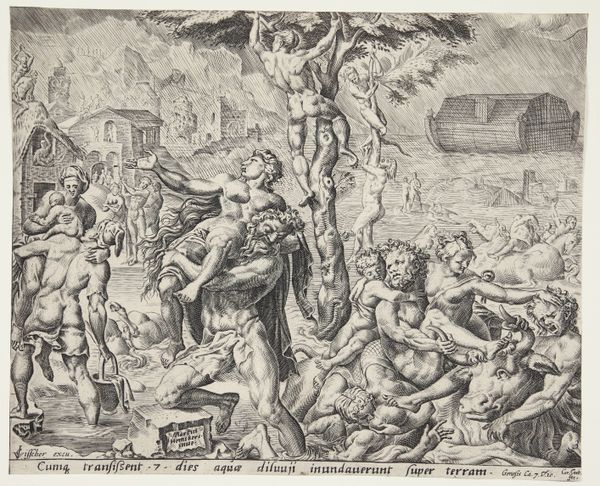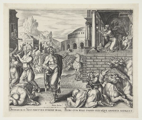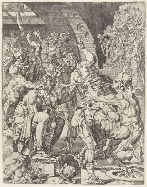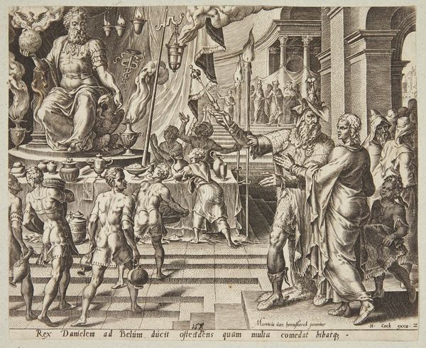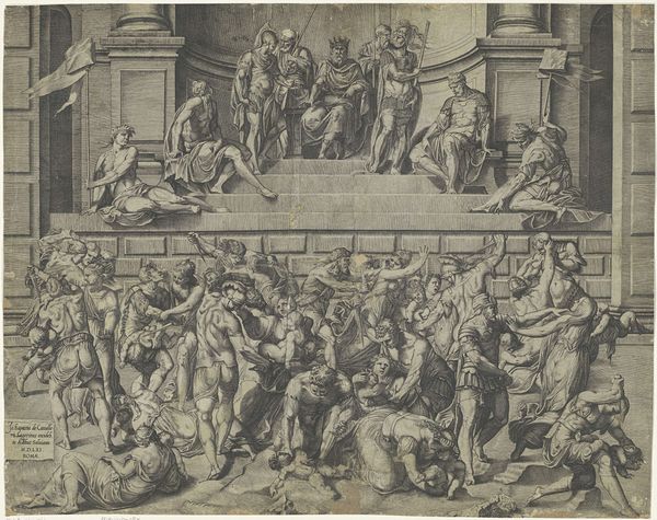 Curator: Here we have "The Destruction of the Temple of Baal and the Slaughter of His Priests," an engraving by Philips Galle, dating from around 1567 to 1570. Editor: Whew, what a title. Visually, it's… intense. An organised riot caught in freeze-frame, perhaps. The contrast of light and shadow gives it a decidedly theatrical feel. Curator: It's Mannerist, so drama is almost guaranteed! Note the composition, with the slaughter occurring in the foreground. Ascending the staircase we see those who have given the order standing rather formally. It's all a very carefully orchestrated chaos. Editor: Orchestrated chaos, I like that. It’s like Galle's saying, “Look how sophisticated I can make destruction look." Do you think the graphic nature of the work aimed at a sensation or a more profound religious feeling? Curator: Considering the context, deeply entrenched religious conflict between the 16th-century Protestants and Catholics, this print likely served a dual purpose. It was to inspire the righteous through depictions of iconoclasm against idols, and fuel anxieties related to heresy, through violent depictions of the opposing "false idols". Editor: Ah, so like propaganda of its time! Those foreground figures do give it such visceral presence. It's almost hard to look away from the grim details despite how formal everything else is around it. What I mean is, all the dynamism is below the King at the top of the stairs, yet there he stands in triumph! Is this irony or an exaltation of monarchy and divine decree? Curator: A complex layering, I'd say! It's not a simple good-versus-evil scenario as it may first appear, with all its conflicting visual cues. We see it with the meticulous rendering, and how the formalist style can communicate power as effectively as the rawest emotion. Editor: That interplay fascinates me! To consider how this print uses drama and artifice not just to narrate an event, but to make you consider how meaning is made. Thank you. Curator: Thank you as well.
