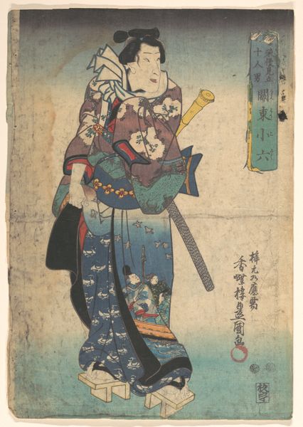 This print by Utagawa Kunisada, now at the Metropolitan Museum of Art, showcases a figure set against an urban backdrop. Kunisada uses a sophisticated interplay of geometric forms and patterns. The subject’s kimono features contrasting textures, while the architectural lines of the buildings create depth and structure. The scene employs a limited palette of blues, browns and creams to evoke a calm but melancholic atmosphere. The composition’s spatial arrangement hints at Kunisada's engagement with contemporary cultural themes. The print uses traditional signs such as the figures gaze to engage the viewer and offer new ways of thinking about representation. Consider how Kunisada destabilizes established meanings through the formal elements in the print. He prompts us to reconsider our understanding of space, perception, and representation.
