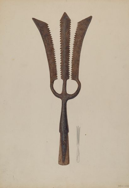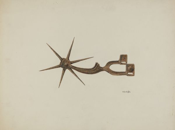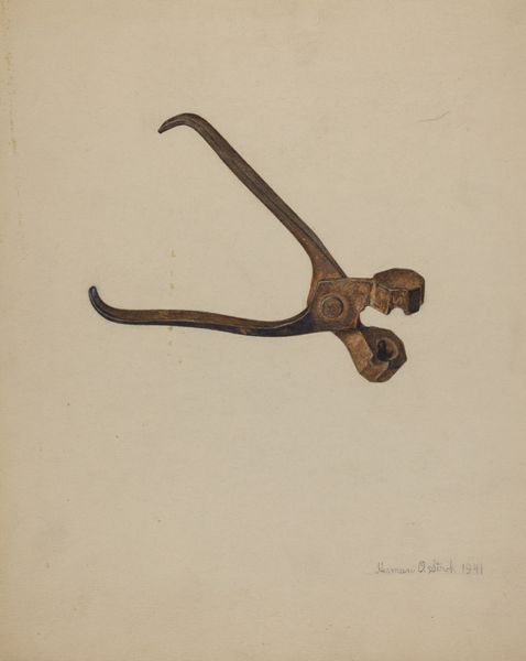 William Frank made this watercolor painting of a bullet mold in the United States sometime in the first half of the 20th century. It depicts a tool for making bullets, a mundane object elevated to the level of art. The image creates meaning through its stark simplicity and focus on a single, functional object. In a time of increasing industrialization, even everyday tools carried the weight of cultural references and historical associations. The geography of the United States, with its history of expansion and conflict, is deeply intertwined with the use of firearms. This image comments on the social structures of its time, subtly critiquing the normalization of violence in American society. Understanding this artwork requires a look at institutional history, the role of art in wartime, and the politics of imagery. Researching the artist’s biography and the cultural context in which he worked might provide a better understanding of the work. Art's meaning is always contingent on its social and institutional context.