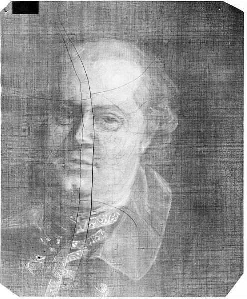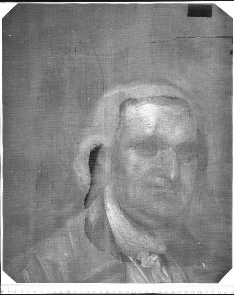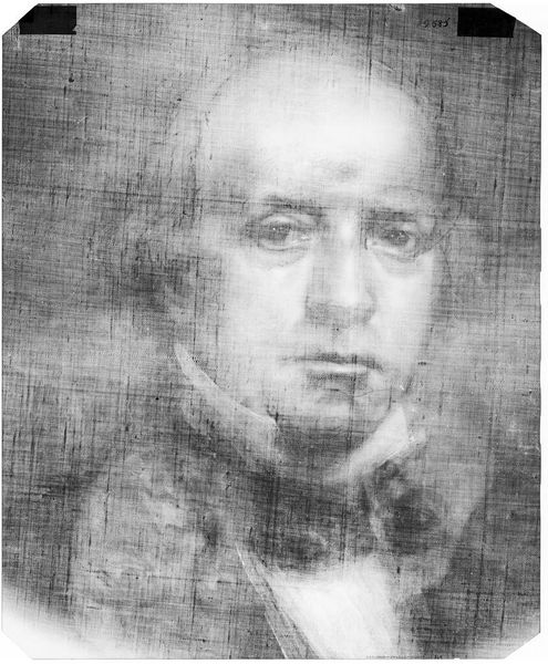 Curator: This is an x-radiograph of the John Quincy Adams portrait, originally by John Singleton Copley. Isn't it fascinating to see the layers beneath the surface? Editor: It's ghostly, almost spectral. The texture of the canvas is so prominent, it nearly obscures Adams's face. It speaks to hidden truths, secrets held within the sitter and the painting itself. Curator: Absolutely. X-radiography provides invaluable information. This one could reveal Copley's process, the materials he used, perhaps even changes he made during the painting. Editor: And in a broader sense, it also reveals power dynamics. Adams, as a figure of authority, is subjected to this invasive gaze. We see him not as he presented himself, but as a collection of material densities. What does that say about how we view authority? Curator: That's a really interesting point! It highlights the shifting perspectives that art history offers us. What do you make of the composition itself? Editor: The starkness of the x-ray strips away any romanticism, which forces us to confront the reality of Adams and the materiality of representation. It reminds me of the weight of history. Curator: Indeed. It's a stark reminder of the unseen layers that comprise art, history, and identity. Editor: A potent reminder that what we see is never the whole story.