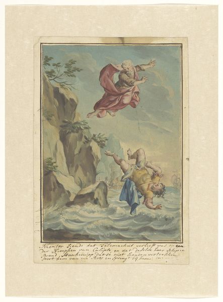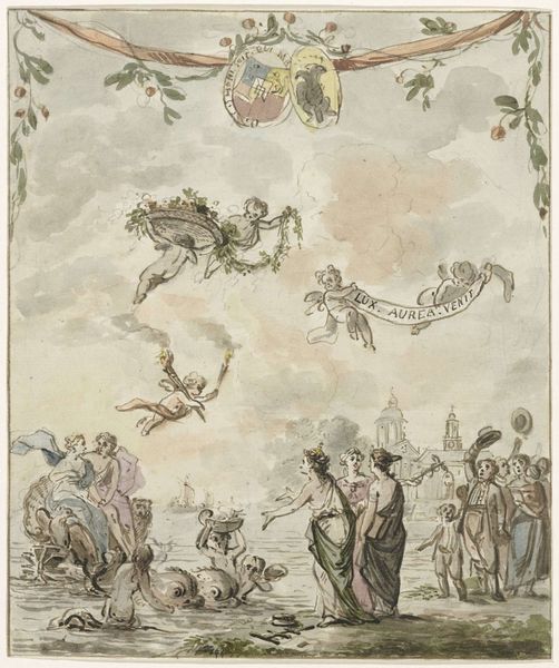 Editor: Here we have "Ontwerp voor een plafondschildering met een putto en twee tortelduiven," or, "Design for a ceiling painting with a putto and two turtledoves," dating roughly between 1677 and 1755, attributed to Elias van Nijmegen. It's a watercolor and ink drawing on paper. The cherubic figure feels weightless, almost dreamy. What's your take on it? Curator: Oh, this *little rascal*! I'm immediately drawn to the feeling of airy lightness. A fluffy cherub floats among equally fluffy clouds. It feels almost as though if *we* were to reach out, we would touch a puff of smoke, nothing substantial... Does it remind you, perhaps, of carefree daydreams? Editor: Yes, absolutely! It also strikes me how it's both a drawing and a design for a fresco. Curator: Precisely. Envision this *scherzo* writ large, upon a palace ceiling! A coy dance of Rococo sensibility where frivolity reigns. The thistle held by the putto seems oddly placed though... Do you think that may have some symbolic meaning? Editor: Hmmm, a thistle… Maybe it represents something prickly intruding upon otherwise fluffy innocence? Curator: A delightful possibility. It's like a visual pun, isn't it? The sweetness offset by a touch of ironic awareness, hinting at love's potential thorns. What is really fascinating to me, is that this thistle reminds us not to fall into the clouds too deeply... The earth has *its* weight, *its* meaning. *Its* thorns! What have we learned looking at this piece? Editor: I love the idea of the thistle representing the 'thorns of love.' That contrast adds such depth. It is far more than what meets the eye at first glance. Curator: Exactly! A glimpse into a world where appearances often belie a richer, more nuanced truth. Art, at its finest, holds up a mirror to the dance between surface and substance.