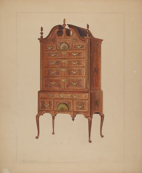 Edward Darby made this drawing of a China Cupboard, but the date it was made is unknown, and it was made with watercolor and graphite on paper. The whole composition lives somewhere between representation and abstraction, with the use of a pared-down color palette, and the reduction of a thing in the world to an arrangement of marks. Notice the overall texture; the slight inconsistencies in the brown tones. Look closely and you see the way the grain of the wood is represented through thin layered washes of paint that allow the paper to show through. Think about how the artist translated a large, three-dimensional, wooden object into a light, flat, translucent image. The artist is building up the image bit by bit, like layers of sediment. The subject matter and process remind me of furniture drawings by Mike Kelley, or even some of the architectural renderings by Agnes Martin. It all speaks to the life of art as a conversation across time, and the idea that meaning is never really fixed.