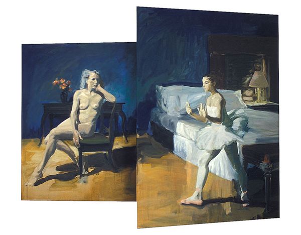 Editor: This is "Naked Maja" by Daniel Greene, an oil painting showing two women seated, with a framed image of Goya's "Naked Maja" hanging behind them. There’s a stillness to this painting, a quiet tension. The direct gaze of one woman really draws me in. What’s your read on this, what jumps out at you? Curator: It's a conversation, isn't it? A dialogue between Greene, Goya, and these modern women. I keep thinking about reflections – the painting within a painting mirroring poses and gazes, the two women perhaps reflecting different aspects of female experience. Do you notice how the vibrant colours in the model on the left fight for prominence, while the other model melts into a complementary colour of a calm blue dress? It’s a gentle rebellion against art historical depictions of women, yet respectful. Editor: Rebellion is an interesting word here! The poses are classical but they’re seated on very ordinary, contemporary chairs. It feels... knowing. Curator: Precisely! There is something of genre painting as the woman’s gaze appears knowing, almost like they are sharing a joke, but where lies the jest? Perhaps a recognition of the historical objectification, contrasted with the everyday reality. It lacks drama. Greene invites us to ponder. How do these women feel, seeing themselves in that lineage? How far have we come? Editor: It’s clever how Greene places the image. Is it a challenge, or a tribute? Curator: I see it as an acknowledgement. Art constantly converses with its past. Greene isn’t erasing the past; he is repositioning it. It's about the layers. This image suggests to me that it's about reinterpretation and claiming agency. It’s about finding your own nude, metaphorically speaking. Editor: I hadn’t thought about the sense of claiming space within art history, how powerful, the wheels are really turning. Curator: Exactly! Art has so much to say. Don’t you feel this perspective changes everything when one truly considers the interplay of tradition and transformation?