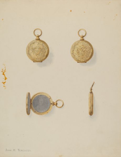 Editor: We're looking at a piece entitled "Brooch" created between 1935 and 1942 by William P. Shearwood, rendered in pencil and watercolor. What strikes me is its almost technical, diagrammatic presentation. What do you see in this work? Curator: I see more than just a visual representation. Consider the date - mid-1930s to early 40s. This object is rendered meticulously, as though preserving a fragment of a world potentially threatened by social or economic turmoil, or even the impending war. This level of precise record keeping reminds me of botanical studies done during imperial expeditions. The seemingly simple choice of rendering what most might call a mere 'bauble' now reads as an attempt at preserving some form of cultural capital. Why choose this particular item, among all things? Editor: So, it's less about the intrinsic value of the brooch itself and more about what it represents as a cultural artifact during that specific time? Curator: Precisely. The choice of medium also speaks volumes. Watercolor and pencil often lend themselves to documentary or scientific illustration. But I am curious, what is your interpretation of the brooch's three different positions in the image? What are we meant to observe through their subtle variance in orientation? Editor: Maybe it speaks to how precious jewelry can be? To view it in multiple ways shows its value to someone... that value then potentially speaks to their societal status during those times of turmoil you mentioned. Curator: Interesting idea. It definitely enriches the interpretation of the piece. Thank you for helping me see this in a new light. Editor: And thank you. I'll certainly consider the socio-political implications of everyday objects much more from now on.