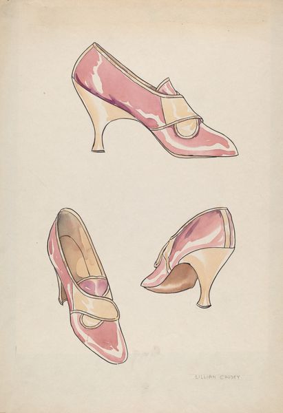 Nancy Crimi designed this rendering of a slipper in an unknown year with watercolor, graphite and ink on paper. The design is of a very specific kind of fashionable slipper. During Crimi's lifetime, women's fashion became increasingly democratized, with ready-to-wear clothing and footwear becoming more widely available. The design of shoes, in particular, became more streamlined and practical, reflecting the changing roles of women in society. This is very much in evidence in the style of this slipper, which is elegant, but also has functional design elements. What is interesting here is how the changing status of women influenced even the most intimate of garments. A historian, using resources such as fashion magazines, photographs, and personal accounts, could research the evolution of the slipper and its connection to women's evolving roles, social status, and cultural values.