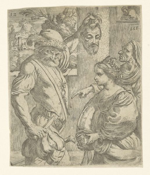 Curator: Leonaert Bramer's "A Man Preaching," housed here at the Harvard Art Museums, immediately strikes me with its intimate scale, only about 15 centimeters square. The monochromatic wash gives it a raw, immediate feel. Editor: Indeed. The dramatic chiaroscuro and the figure's raised hand point to the enduring iconography of religious ecstasy and transformation through language. It suggests an almost theatrical conversion. Curator: And consider the material context: This is not a grand oil painting meant for a church, but an intimate drawing. Was this for study? A preparatory sketch? The very act of sketching itself becomes a powerful tool here. Editor: Absolutely. Note how the expressions of the listeners are rendered; their faces half in shadow, symbolizing perhaps their internal struggles with faith and doubt. Curator: It's as much about the depiction of labor—Bramer's labor in producing this image, the preacher's labor in delivering his sermon—as it is about religious experience. Editor: I find myself returning to the symbolism of light and shadow, suggesting an inner psychological landscape opened by the spoken word. Curator: For me, the real interest lies in how Bramer uses such simple materials to evoke so much emotional and historical weight. Editor: A powerful little piece, reflecting both the intimate and universal qualities of faith.