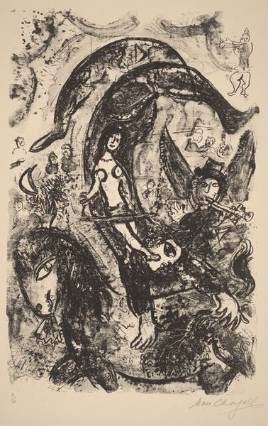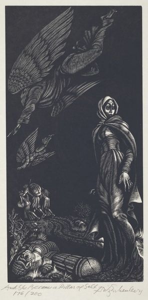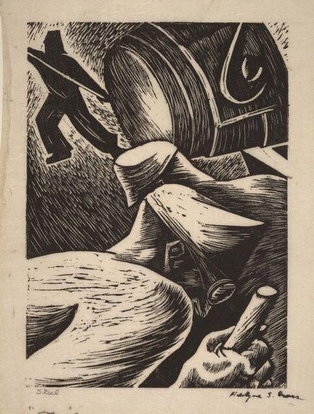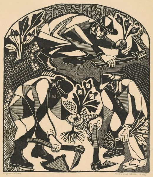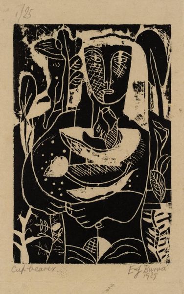 Editor: This is "Merry Xmas From The Zorachs," a woodcut print created by Marguerite Zorach in 1921. It has an interesting bold and graphic feel. I am immediately drawn to the stylized mother and child embraced at the center. What do you see in this piece that informs its symbolism and emotional impact? Curator: The composition is quite striking, isn’t it? Look at how Zorach uses the black and white contrast to define not just forms but also to suggest emotional states. Notice how the negative space dances around the figures and the backdrop of foliage that also look like sun rays, but with a primitive hand-crafted aesthetic. What feelings are conjured for you with this simplified language? Editor: It feels warm and intimate, while also slightly unsettling. The lack of detail makes it almost dreamlike. Also, why the emphasis on the mother's physicality; what’s the purpose? Curator: Her choice to portray motherhood with such frankness pulls from a deep well of archetypes, where woman embodies fertility, nurturance, and earthly power. Her direct gaze implies courage, inner strength. Remember the woodcut style here allows to evoke a strong and bold symbol, rather than be a depiction of reality. Don’t you think this expression becomes a new type of universal representation? Editor: I see what you mean. It’s less about capturing a specific person and more about representing the universal idea of mother and child, especially through such symbolic lines. It seems this Christmas message extends beyond the personal. Curator: Precisely. It taps into an eternal narrative and uses bold design to offer something primal, yet deeply resonant, in this Yuletide message, full of hopes for continuity and shared roots. Editor: Thinking about those themes, that really changes my perception of the piece. I can see how Zorach uses simplicity to invite contemplation. Thank you.