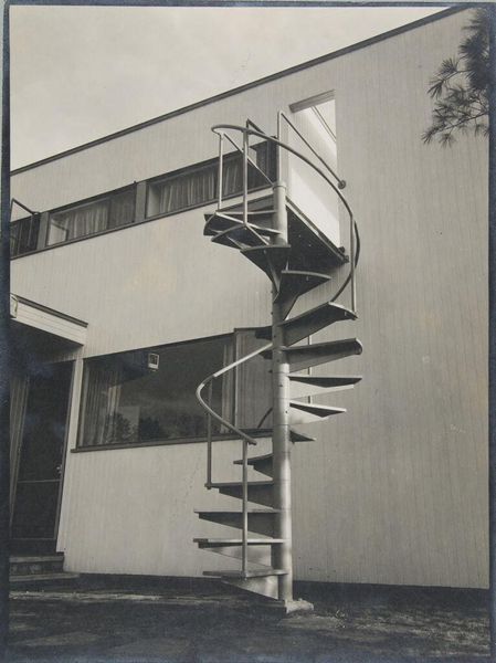 Curator: This is Paul Davis's photograph, "Gropius Residence, Lincoln, Massachusetts, 1938," now residing in the Harvard Art Museums. Editor: Stark, isn't it? The interplay of light and shadow across that facade is almost brutal. You can really feel the materials. Curator: Absolutely. It reflects the International Style's clean lines and functional aesthetic, so central to the Bauhaus movement Gropius championed. Editor: And think about the labor! The steel for that spiral staircase, the concrete…all manufactured, shipped, assembled. It embodies industrial processes. Curator: Indeed, it’s a fascinating look at how European modernism was translated and received in America, with its own set of social and cultural considerations. Editor: For me, the image throws the building’s materials and construction process into sharp relief, something easily overlooked. Curator: It's an important record of architectural history and the politics embedded within design. Editor: A really interesting moment, captured in monochrome.