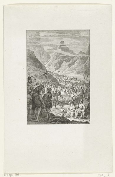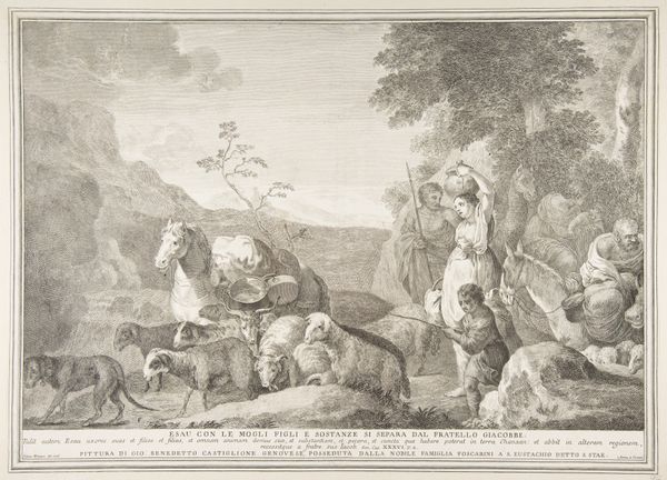 Pietro Monaco's etching, "Departure of David the Shepherd from the House of His Father" captures a biblical scene in delicate lines. The image is dominated by a sense of movement and a strong diagonal composition, leading the eye from the lower left corner towards the distant mountains. The scene depicts David’s departure, amidst a flurry of sheep and burdened figures, rendered in fine lines and subtle tonal variations. The interplay of light and shadow creates a dynamic texture, emphasizing the textures of wool and foliage. The engraver’s use of line – from the tight hatching that defines the animals to the freer strokes describing the landscape – gives depth and vitality to the scene. This work can be interpreted through semiotics, where each element — the shepherd, the sheep, the landscape — represents broader themes of guidance, innocence, and destiny. The print reflects the artistic conventions of its time while hinting at deeper philosophical inquiries. It is a detailed and formally rich engraving that invites ongoing contemplation of its artistic and cultural meanings.