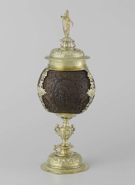 Curator: Good morning, and welcome. Today, we’re looking at a remarkable piece called “Cup with Cover,” crafted by Hans van Amsterdam sometime between 1533 and 1534. It resides here at the Metropolitan Museum of Art. Editor: What strikes me first is the sheer opulence of it. The silver positively gleams, contrasting so vividly with the darker body of the cup. It evokes a sense of royal ceremony. Curator: Indeed. What’s fascinating is the combination of materials. We see silver meticulously worked for the stand and lid, contrasted with what appears to be a carved wooden body. This melding of techniques is quite characteristic of the period, pointing to specific workshops known for their mixed-media expertise. It blurs lines, doesn't it? Challenging conventional art historical separation between high art and what some might categorize as mere craftsmanship. Editor: Absolutely. And think about the cultural context. The level of detail here isn’t just aesthetic. The imagery is a narrative—I can make out scenes that might reference biblical stories. These pieces would have served as incredibly potent signifiers of status and power, particularly within court circles. Who might have commissioned this? Curator: The commissioner was most likely someone of considerable wealth and influence; possibly even someone within a royal family given the expense of precious materials. This would be commissioned not just to drink from, but a public performance of wealth to legitimize and assert dominance, a visual manifestation of dynastic claims, as the scenes reference power, order and morality. The choice of narrative scenes also aligns it with broader socio-political expectations of the time, which museums, like our very own, plays a part in displaying and preserving these ideals. Editor: And looking at the labour involved! Someone would have not just mined this, worked and carved this material. Consider the distribution networks, too! Where would it have been stored? Who was able to consume this and enjoy it? The work speaks volumes of the economies circulating these trades and workshops and labor. Curator: Precisely. It's easy to become fixated on the finished object, forgetting the whole apparatus behind its creation and initial consumption, of social relations and historical contexts and hierarchies, a window to the distribution of material across the world and social impact during that time. Editor: It shifts how we appreciate this object when you see this for what it truly is. It ceases to be an antiquated craft and instead something very relevant for the modern age, when consumption and craft are evolving in tandem once more. Curator: Well, it's an object with remarkable insight into labor and the display of art during the Renaissance era; a testament to that complex period in history. Editor: I think that brings it alive in a really impactful way.