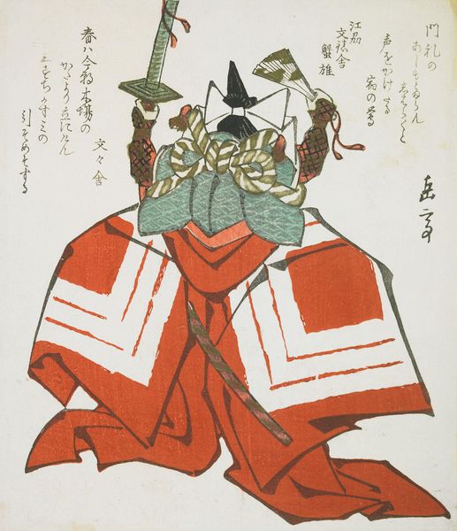 Editor: This woodblock print by Utagawa Kunisada depicts the actor Ichikawa Danjūrō VIII in a *Shibaraku* performance. The powerful red and white costume really grabs your attention, but what strikes me is the inclusion of poetry. What can you tell me about that? Curator: The poems, by Danjūrō's father and another writer, locate this print within a larger cultural context. *Shibaraku* was a signature role for the Ichikawa lineage, and these prints served to publicize and celebrate their theatrical legacy. They also served as a kind of fan art of the public figure that the Kabuki actor occupied. Editor: So it’s not just a portrait, but a statement about family, art, and popular culture all at once. That's fascinating. Curator: Precisely. The print becomes a record of a specific performance, embedded in a web of social and artistic relationships.