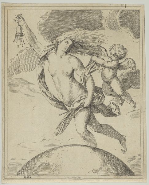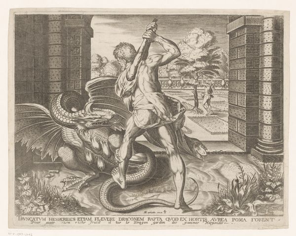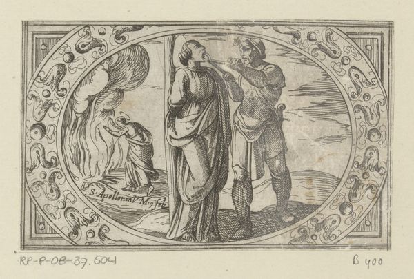 Editor: Here we have Antonio Tempesta's engraving, "H. Reparata," created sometime between 1565 and 1630. The starkness of the lines gives the scene a brutal, almost unsettling feel. What catches your eye in this piece? Curator: Immediately, the power of symbols strikes me. Look at the dove. A dove is a widespread motif. Editor: You mean the dove representing peace? I hadn't thought about that, considering the… violent beheading depicted. Curator: Precisely. The artist creates an intentional tension by juxtaposing images. It suggests the soul's flight to paradise after martyrdom, carrying connotations from antiquity and persisting even now. Notice, too, the flames behind the executioner; perhaps calling on classical representations of Hell. Is there something else you notice? Editor: There’s another figure standing in the flames! So, would that be a depiction of Saint Reparata? Is she both dying, and already in Heaven? Curator: Indeed. Note the use of line. Do you think it successfully communicates meaning? The engraving uses *horror vacui*, as if the scene needed to be completely filled. What emotions would be evoked? Editor: I guess that would add to the feeling of tension. It makes the whole scene feel restless. Curator: And within that restlessness, there’s the underlying concept of eternal reward, of transcendence despite violence. Images like these helped to establish collective cultural memories through symbolic representation. Editor: So, it’s not just about the scene, but about the long afterlife of its meaning. I'll definitely remember to look for those connecting threads. Curator: Precisely, because art’s cultural power resonates far beyond its creation.