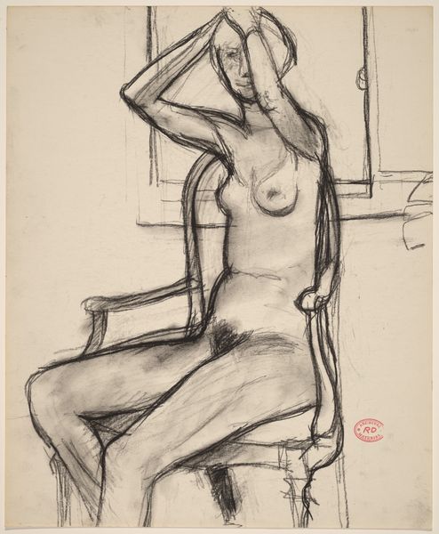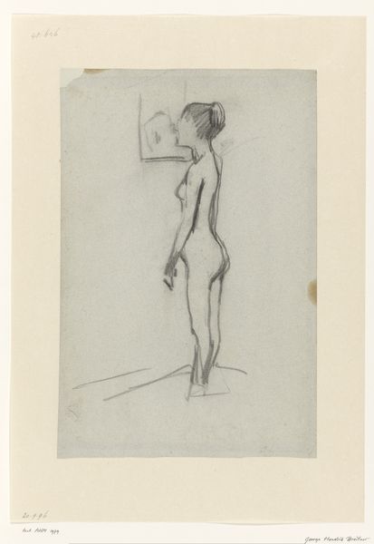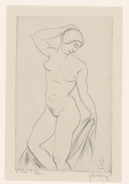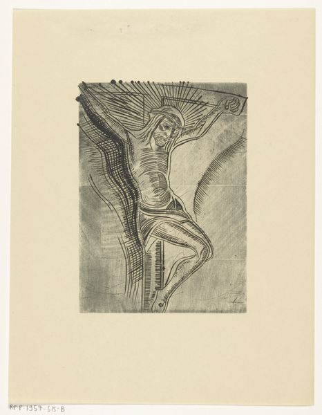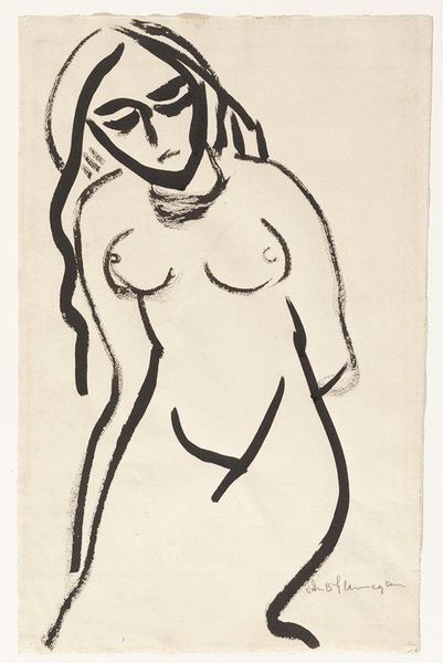 This is "Papoesche", a woodcut print by Johannes Frederik Engelbert ten Klooster. The stark contrast of black ink on paper immediately grabs you, a binary of light and dark where the process is laid bare. Look at the way ten Klooster carved out the figure, each line precise yet bold, creating a texture that's both rough and refined. You can almost feel the artist's hand at work, carving away at the woodblock, leaving behind this powerful image. The figure's strong stance and simplified features suggest a connection to primal forces, and the woodcut medium emphasizes that sense of raw, untamed energy. The lines create a certain dramatic quality in their thickness and the shadows which create the lines of the body. It reminds me of the German Expressionists, like Kirchner or Heckel, who used similar techniques to convey intense emotions and social commentary. But there's also something unique here, a personal touch that sets ten Klooster apart, showing the enduring power of art to connect us across time and movements.