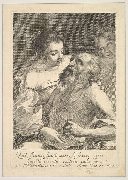Curator: This engraving, dating from after 1629 and currently held at the Rijksmuseum, is titled "Lot and His Daughters". Editor: It’s visually quite stark; the tonal range is narrow, focusing attention on the density of lines. It’s rather unsettling, wouldn't you say? Curator: Indeed. Note the artist's use of hatching and cross-hatching to create a sense of depth and volume. The figures emerge from a textured background, which amplifies the drama. What does that choice tell you about its making? Editor: I immediately think about the engraver laboriously carving into a metal plate, each line representing time and pressure. There's a deliberate contrast between the smooth skin of the daughters and the etched roughness of Lot's beard – textures achieved by manipulation of the burin and a commitment to an iterative process. It’s as much about skilled labor as artistry. Curator: And observe how the composition guides our eye. Lot, seemingly drunk and vulnerable, is positioned centrally, flanked by his daughters. Their gaze, averted from the viewer, draws us into their secretive world. The engraving also includes the title and credits at the very bottom of the engraving as integral parts of its formal composition. Editor: That subtle visual direction leads us to contemplate what motivated the patron to request that particular representation. It leads us to understand the story beyond religious scripture – a moment in which power dynamics between women and their father shifted because of desperation in fleeing Sodom. What impact do you think it would've had for early audiences given their views of sexuality, morality, and perhaps patriarchy at the time of the work's production? Curator: The success of "Lot and His Daughters" stems from this technical virtuosity, offering viewers both a visually striking composition and complex psychological insights. It reveals something deeper about the story itself as well. Editor: I concur. Examining how engravings functioned socially provides vital information in that their material accessibility and replicability allows stories that once rested solely in paintings and texts become popularized during this early era! This specific process of artistic reproduction highlights broader socio-cultural shifts during that time!