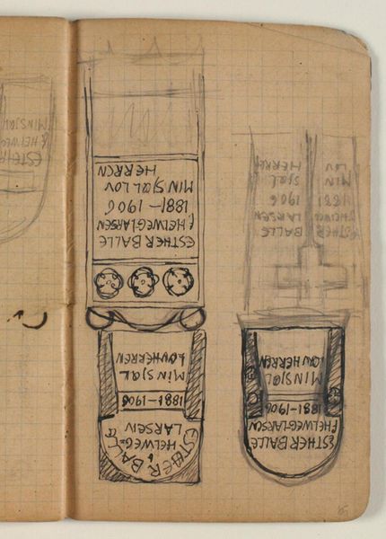 This is a sketch for a grave monument, made by Niels Larsen Stevns, sometime in the early 20th century. It's on a small page from a notebook, and the artist uses a humble graphite pencil. What strikes me is the process here. It feels like Stevns is thinking aloud, working through ideas right on the page. There are multiple versions of the design, each slightly different, like he’s turning the monument around in his mind. Look at how the lettering is carefully inscribed, then crossed out and rewritten! It reminds me of my own studio practice, how one idea leads to another, and the messiness of that search. The grid of the page is visible underneath the drawing, giving it a grounding, like the first layer of a painting. And the way the lines are drawn, a little tentative, a little unsure, adds to the feeling of intimacy. It reminds you that even a monument, something solid and permanent, starts with a fragile idea. In a way, artists like Cy Twombly and also folk artists remind us of this ongoing exchange of ideas across time. I guess art is never really finished, is it?