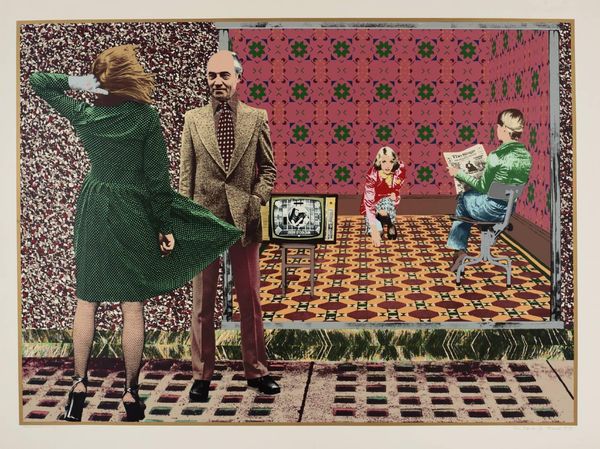 Curator: Tim Mara's unsettling print, "Power Cuts Imminent," presents a collage of fractured realities. What is your initial take? Editor: The juxtaposition of textures—the glossy tiles, the worn leather—creates a striking unease. The composition feels disjointed, almost dreamlike. Curator: Mara, who died in 1997, was deeply interested in how technology shapes identity and social interactions. This work encapsulates his critique of media saturation. Editor: I'm drawn to the formal elements. The grid motif, repeated in the tiles and background pattern, suggests a controlling structure, disrupted by the organic forms. Curator: The figures, isolated and seemingly disconnected, speak to themes of alienation and the diminishing of human connection in the face of technological advancement. There is a palpable sense of powerlessness, and impending darkness. Editor: The color palette—muted tones punctuated by flashes of brightness—heightens the sense of unease. The whole image is a series of formal relationships that create tension. Curator: This image serves as a reminder of the pervasive influence of technology and its impact on our lives. Editor: A compelling visual experience. The artwork invites further examination of its underlying formal relationships.