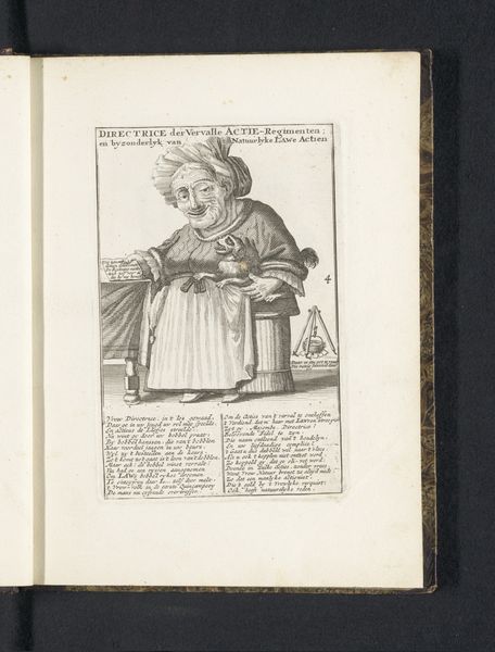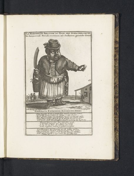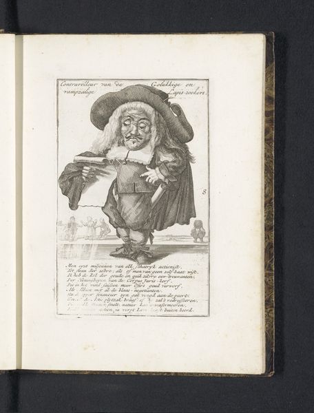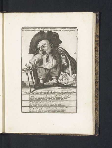 Curator: This engraving, dating from around 1718-1720, is titled "De dwerg Hali Nasili Pascha," attributed to Joost van Sassen. The caricature-like depiction caught my eye—there's something both amusing and slightly unsettling about the disproportionate figure. What's your initial take on the work? Editor: It definitely has a peculiar quality. The texture achieved through engraving is interesting. What are the primary formal elements that you observe? Curator: Note the deliberate manipulation of proportion—the oversized head, the dwarfed limbs. This creates a visual tension. Observe how line is used, with delicate strokes defining the texture of the beard and clothing, contrasting with the broader, simpler forms of the body. How does this contrast inform your interpretation? Editor: I suppose it emphasizes the face and the detail there... and, almost satirizes the body by diminishing its presence, drawing all focus to the head. Curator: Precisely. And the monochrome palette emphasizes the formal construction—we are compelled to analyse line and form without distraction. What does that visual hierarchy suggest about its subject and potential function, beyond simple representation? Editor: It definitely lends itself to interpretation beyond the literal, something about power or the importance of appearance versus physical presence, perhaps? Thank you, this has been illuminating! Curator: Indeed, the starkness and structured composition force us to focus on the inherent symbolic and satirical potential of the piece, a lesson in close reading, even within a seemingly straightforward image.