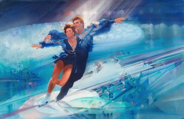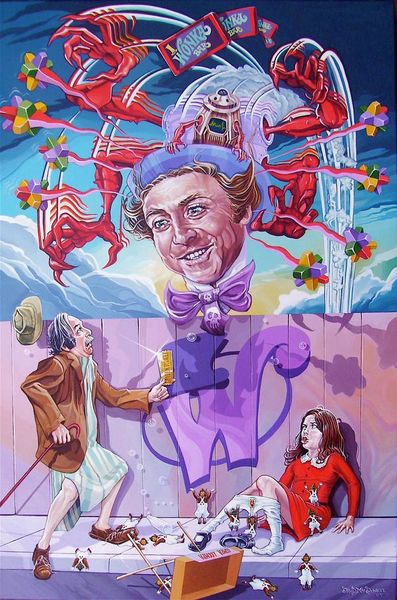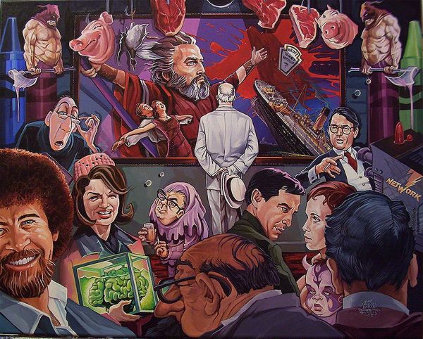 Editor: We're looking at Dave Macdowell's painting, "Flying While Intoxicated." It’s an acrylic painting mixing fantastical figures and a cityscape with an apocalyptic backdrop. There's a lot to take in. What strikes me is the cartoonish rendering mixed with such dark subject matter. How do you interpret this work, focusing on the painting itself? Curator: Immediately, the dynamic interplay between the meticulously rendered details and the deliberately naive composition arrests my attention. Notice how the artist uses hard lines and vibrant, almost garish colors to delineate the figures and objects. The overall structure verges on chaos, yet there's a calculated balance achieved through the strategic placement of key elements, particularly the contrast between the cool tones of the car and the warm hues of the explosion. What do you observe about the light source in relation to the focal point? Editor: The light source seems inconsistent, almost as if each element has its own spotlight, which enhances the painting’s dreamlike quality. It really calls attention to the characters in the car, but also highlights the explosion in the background. Curator: Precisely. The lack of a unified light logic serves to flatten the pictorial space, intensifying the surreal impact. It draws attention to the surface and its inherent qualities, freeing the work from representational constraints. It seems to emphasize planes rather than depth, but creates, counterintuitively, multiple distinct depth perspectives across the space. The structural relationships invite a re-evaluation of the relationship between chaos and form in the work. What have you learned? Editor: I’ve never thought of chaos having such structural integrity and planning. It encourages looking beyond subject matter, analyzing elements like color and space, instead of immediately seeking a narrative explanation. Thanks! Curator: A close analysis often provides rewards inaccessible by simply decoding what is visible. Indeed, this experience reminds us of the power and enduring value of the Formalist tradition.