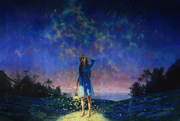 Editor: Timur Akhriev's "Tenere," created in 2022 using acrylics, is captivating. The figure cradling what seems to be a radiant orb gives off such an ethereal, almost mystical vibe. What symbols do you see at play here? Curator: The glowing orb immediately recalls imagery of the sun, doesn’t it? In many cultures, the sun is associated with life, energy, and enlightenment. But notice how it’s being held, protected almost. Is it a source of power to be guarded, or perhaps something fragile that needs nurturing? The dark background speckled with starlight also evokes the cosmos, that vast unknown we've always tried to map through stories and symbols. Editor: I didn't consider the act of holding the sphere. It feels quite deliberate now that you point it out. The artist’s choice of colors – warm tones against that deep blue – it's so striking. Curator: Precisely. The color contrast heightens the emotional impact, doesn't it? Red has often symbolized passion or sacrifice, while the blue evokes both tranquility and mystery. The surrounding foliage suggests a natural, almost Edenic setting. How do all these visual cues intertwine? Editor: Maybe the painting is about humanity’s relationship with knowledge or perhaps creativity, suggesting both its immense potential and the responsibility that comes with it. Curator: An interesting thought! The vulnerability of the figure juxtaposed with the brilliant sphere sparks all sorts of intriguing possibilities. It’s the symbolic ambiguity that invites continued reflection. Editor: This really shed a different light on the painting, especially thinking about the iconographic nature of the sun and its relation to the figure holding the sphere. Thank you! Curator: My pleasure! Visual symbols really enrich our reading of the artwork!