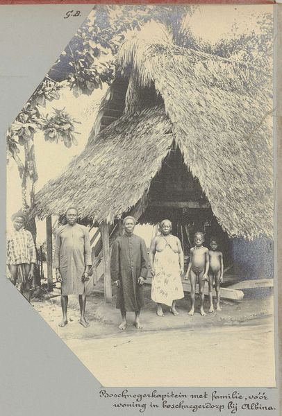 Editor: This gelatin-silver print, "Contractarbeiders en opzichters voor arbeiderswoningen," dating from between 1890 and 1900 and attributed to Heinrich Ernst & Co, is such a fascinating image. It strikes me as a very staged scene, almost like a tableau vivant. What jumps out at you? Curator: Ah, "staged" is a good word, almost a loaded word these days, isn't it? For me, the very static nature is evocative. It almost shouts of the societal structure of the era—those with power posed stiffly in a carriage or standing ramrod straight, while the workers are seated or positioned almost as props. There is a real discomfort that you can almost feel. Don't you find that contrast revealing? Editor: Absolutely! There’s such a clear visual hierarchy. I hadn't considered the feeling of discomfort that the positioning gives rise to, it seems almost...purposeful. What is that thatched structure behind them? Does that offer insight to the work? Curator: Good eyes! To me, the building serves a few purposes. Compositionally, it frames the scene. But symbolically, the humble materials of the structure, probably mimicking what worker’s family houses are built from, are juxtaposed against the crisp European clothes and authoritative stance of the overseers. The very earth seems to support those workers, they are quite literally grounded. It makes me wonder: what narrative are the artists trying to convey? Is it critique or just documentation? It makes you think! Editor: I never would have considered how much of the power dynamics are built directly into the backdrop itself! Thanks, this really changes how I see it. Curator: My pleasure! Art is, after all, just seeing what’s always been there, but noticing it for the first time, eh?
