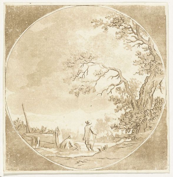 Editor: Here we have Charles Cornelisz. de Hooch's "Rocky Landscape With a Bridge and a House," created sometime between 1620 and 1638. It's a drawing, an etching, and also a print. It's all brown ink, and gives off a rustic feeling, like a scene observed directly from nature. How do you interpret this piece? Curator: I see an active engagement with the materiality of the etching process. The lines aren’t just depicting a scene; they are revealing a whole system of production and circulation. Editor: Could you expand on that? Curator: Consider the Dutch Golden Age context. Etchings like this weren’t simply aesthetic objects. They were commodities. De Hooch is engaging with the burgeoning print market, where images of landscape became increasingly popular for a growing middle class. The relatively simple materials – the plate, the acid, the press - allowed for reproduction on a scale unseen before. It challenges traditional boundaries. Where do we draw the line between fine art and the means to create such objects for mass production? Editor: So you’re saying the *making* of the work is as significant as the image itself? Curator: Precisely. Look at the lines—the way they vary in thickness and density, reflecting the labor involved in creating the plate. The seemingly simple landscape then becomes a testament to the shifts in labour and production during this time. Consider, who owned the means of producing the copperplates, how were they circulated, who could afford them and for what reasons? What does this all say about society's view of landscape art? Editor: I hadn't considered that. It’s fascinating to think about the social and economic forces intertwined with this image. It's much more than just a pretty picture, really a sign of a larger socioeconomic shift in how people consumed art and landscapes at the time! Curator: Indeed! Looking through a materialist lens brings a completely different understanding.