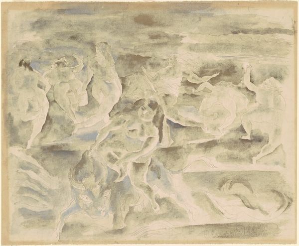 Curator: Ah, this watercolor is like a breath of fresh air. It's called "Sky," made circa 1900-1910 by John Singer Sargent. The brushstrokes seem almost weightless. Editor: It evokes a kind of freedom, doesn't it? It's less a portrait of a sky and more a feeling. The use of watercolors captures something ephemeral, like a fleeting emotion, as the quick movements remind me of how modern life increasingly moved away from tradition toward constant renewal. Curator: Sargent, although primarily known for his portraits, painted many plein-air landscapes, showcasing an Impressionistic sensibility. These works were rarely exhibited in his lifetime but point to how much he valued watercolor as a means of exploration. This interest reflects the explosion of interest in the visual expression of inner emotionality. Editor: The cloud formations here suggest symbolic meaning, where clouds often represent the passage of time or transformation, a reminder of constant change. And in art history, there’s a lineage from Romanticism of sky as sublime... Do you see him tapping into that tradition here, moving away from formal portraits into what he truly felt about art? Curator: Absolutely. One might even argue he uses the sky as a canvas to explore abstract composition—it seems more concerned with movement and color than the accuracy of cloud depiction. Note that this was made around the turn of the century. The interest in watercolor here aligns with increased opportunities to create and show this style, thanks to various societies and exhibitions that emerged, reflecting the growing appeal of informal work outside the salon system. Editor: The limited color palette is striking. Various blues, shades of gray... And how they interplay suggests both melancholy and tranquility. Given the era, perhaps this palette reflects cultural shifts, mirroring evolving moods during significant historical change? The subdued nature evokes a sense of looking back as society looked ahead to industrial progress. Curator: It does possess a nostalgic quality. By breaking from the strict constraints of traditional landscapes, Sargent created an emotional space through these washes of watercolor that I think reflects the interior states increasingly explored during the modern era. Editor: A beautiful expression of how art can provide comfort during significant shifts, and offer lasting inspiration for the audience. Curator: Yes, I am intrigued by how Sargent reveals new emotional terrain, pushing painting beyond traditional boundaries and demonstrating the depth latent in what may seem a very "light" medium.