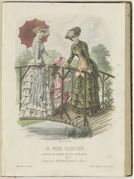 Curator: It feels like stepping into a dream. The "Journal des Dames et des Demoiselles," a print from 1872, immediately pulls me into a world of soft light and leisurely pursuits. Jules David captured such a serene moment. Editor: Absolutely! These women, delicately rendered in pen, watercolour, and colored pencil, appear to embody the ideal of 19th-century bourgeois womanhood. Their very posture signals an embrace of gentility. Curator: Yes, the title speaks to its context. "Journal des Dames et des Demoiselles" would have been a very popular fashion plate, providing visual updates of what's on-trend. A visual news source if you will! Editor: Indeed! It provided instruction, perpetuating ideals. Notice how their clothing practically merges with the soft background, almost a watercolour wash, which underscores the artificiality of this pastoral idyll. It's romantic, but it is absolutely contrived, don't you think? Curator: Contrived? I'd say carefully constructed. Like a poem, you wouldn't say poetry is "contrived" because the artist organizes words and ideas? These figures embody artifice in the best possible way, reflecting their position and performance in society, no? Look at that glorious lavender frock with all its delicate folds! Editor: True, this is about image-making, the careful engineering of self-presentation for public consumption, right down to the last ruffle. I wonder how closely women engaged with this "advice?" How influential was the publication's projected vision? Curator: Ah, and there is always a negotiation isn't there? With every new mode, every changing line, there's push and pull; rebellion and tradition twirling together on the same stage. It makes one wonder: were their souls as colourful as their attire? Were they merely aesthetic beings, or could something fiery exist under layers of taffeta? Editor: Maybe we can only speculate. Either way, these representations were currency. I see a constant transaction between lived realities and prescribed images. And it makes this unassuming drawing much more meaningful. Curator: Agreed. Art imitating a life imitating art. Thank you, ladies. Editor: Quite. An illusion beautifully, even hauntingly, maintained.