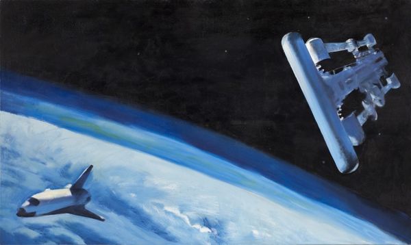 John Berkey made this painting of space stations and satellites sometime in the 20th century, probably with acrylic or oil. The marks are so smooth, it’s as if he’s airbrushing the cosmos. Look at the satellite closest to us. The paint is layered in such a way that it gives the impression of a machine made up of different panels and textures. The light catches these details in surprising ways, it is almost as if the satellite is a complex jigsaw puzzle of reflective surfaces. The real kick, though, is how Berkey captures the feeling of being out there, floating in the dark. It reminds me of Chesley Bonestell’s space paintings, or maybe even some of those old sci-fi book covers. Berkey seems to be saying that outer space is not just a place, but a vast canvas of endless possibilities.