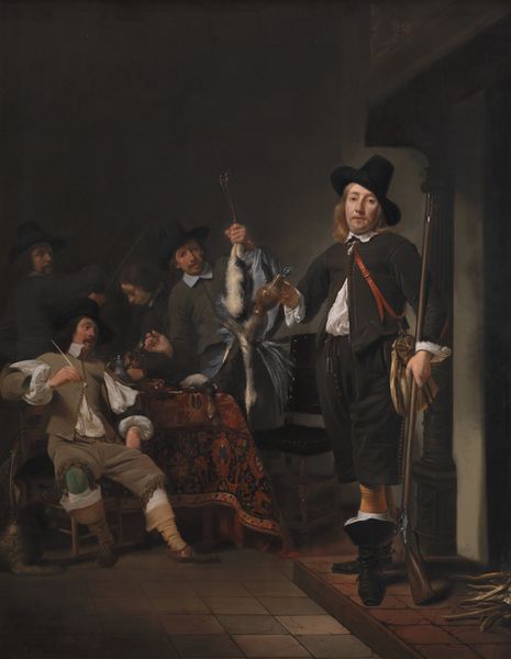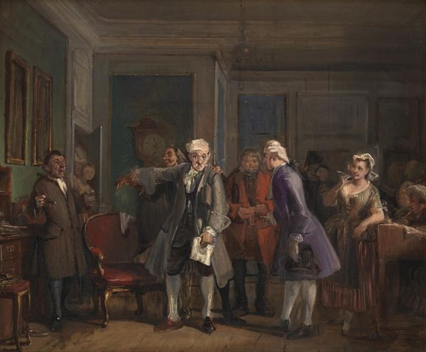 Editor: So, here we have David Bles's "The Patricides, 'Each According to Their Own Nature,'" painted in 1869. It looks like a scene of chaotic merriment—or perhaps a rather pointed parody of one. The scale is large and filled with so many figures; what strikes you when you look at it? Curator: It strikes me how the artist uses the trappings of domesticity to critique the social order. Consider the title, "Each According to Their Own Nature." Bles seems to be suggesting that societal roles, particularly those imposed on women and children, are inherently restrictive and absurd. The performative nature of this domestic chaos hints at a deeper critique of 19th-century bourgeois life and gender dynamics. Editor: Can you elaborate on "performative"? Curator: Absolutely. Look at the woman covering her ears—is that genuine distress, or a staged reaction expected of her? Are the children expressing genuine joy or acting out roles within this elaborate game? Consider how notions of “femininity” are staged versus felt. In what ways does this staged-ness point towards ideas present in feminist theory? Editor: I see what you mean. It’s as if Bles is revealing the artificiality of these family interactions. How does the historical context influence our reading? Curator: In the 19th century, particularly in Western Europe, there was an emphasis on domesticity as a marker of status and morality. But Bles, as part of a shift occurring then, uses genre painting, traditionally celebratory, to expose the constraints inherent in these ideals. It makes us question how power dynamics play out within the family unit and reflect on their wider social implications. The art then starts a critical discussion about labor and its societal role for all the actors represented. Editor: That's a completely different reading than I initially had. I was so focused on the surface-level narrative, I missed the underlying critique. Curator: Art often functions on multiple levels. Exploring the social and historical context is key to unraveling these layers of meaning, and considering gender adds a really helpful, contemporary framework here. Editor: Thanks for sharing; it's made me think about the power of art as a form of social commentary.