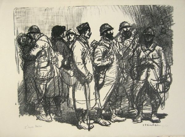 Théophile Alexandre Steinlen created this drawing titled, *A bientot pour de bon*, using expressive strokes and a somber palette. The composition is dominated by a procession of figures, tightly packed together, creating a sense of collective movement towards an uncertain future. The figures on the left are drawn with a higher level of detail, whereas the figures on the right seem to fade. The artist uses the stark contrast between the dark, densely shaded forms of the figures and the negative space of the background to evoke feelings of melancholy and resignation. The linear quality of the drawing, created with charcoal or a similar medium, emphasizes the skeletal structure of the scene. The artist uses the structure to explore themes of loss, separation, and the human condition in times of conflict. The title, meaning "Goodbye Forever," adds a layer of irony to the image. The use of linear perspective, guiding the viewer's eye into the distance, reinforces the notion of a one-way journey. The bleakness of the scene challenges traditional representations of heroism and valor. Steinlen’s masterful use of line and shadow transforms the personal tragedy into a universal symbol of the human cost of war, leaving us to reflect on its lasting impact.