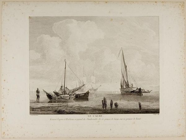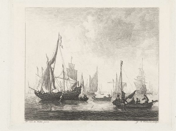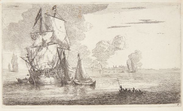 This finely detailed drawing of a ship firing a salute, was made by Robbert Muys. The composition is a study in contrasts, juxtaposing the stillness of the immediate foreground with the dynamic energy of the ships in the distance. Notice how the artist uses light and shadow to create depth and texture, the sky rendered with delicate strokes to evoke a sense of atmospheric perspective. Muys employs a structural system where the horizon line acts as a visual anchor, dividing the composition into distinct registers. The precise linework and detailed rendering of the ships suggest an interest in maritime accuracy. The ships become signs of Dutch maritime power. The choice of subject matter reflects broader cultural concerns related to trade, exploration, and national identity during the 18th century. Yet, it also hints at the volatile nature of maritime life. The interplay of light, shadow, and form, however, remains open to interpretation.