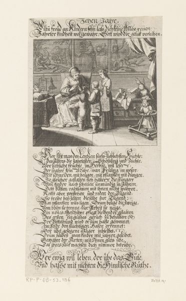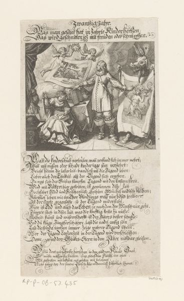 This is Conrad Meyer's “Schilder aan het werk,” made in the 17th Century. Note how the composition is split horizontally between a scene above and a block of text below. The upper scene portrays an artist in his studio, surrounded by his family on the left and an allegorical painting on the right. Meyer has used hatching and cross-hatching to create form and shadow, giving the scene depth and volume, though it is small in scale. We can read a juxtaposition of art, family, and allegorical representation within the image. In Meyer’s era, art theory often intertwined with moral and philosophical ideas. This image reflects those concerns. The artist's family and the depiction of his craft suggest the dignity of labor and the integration of art into domestic life. The allegorical scene alludes to broader moral or philosophical themes that the artist engages with through his work. Consider how Meyer uses form to blend the personal, the professional, and the symbolic. By doing so, he elevates the role of the artist as someone who not only practices a craft but also embodies cultural and moral values.