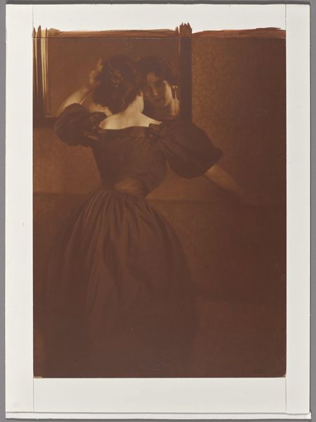 Editor: Here we have Heinrich Kuhn’s "Lady in front of the mirror," a gelatin-silver print from around 1904. There’s a hazy, dreamlike quality to it… almost like looking at a memory. What symbolic reading can we give it? Curator: It is more than a portrait, isn't it? Kuhn gives us a symbolic staging, inviting the viewer into an intimate encounter. The mirror is an age-old symbol, a threshold between the physical world and the realm of the psyche. What does it reflect? The lady, certainly, but perhaps also a deeper self, an aspiration, or a hidden fear? Editor: So the mirror isn’t just about vanity then, it’s about self-reflection in a psychological sense? Curator: Precisely! Think of the pictorialist movement. Kuhn sought to elevate photography to the level of painting, to express inner states, and to conjure a mood that speaks to our collective unconscious. What memories or emotions does it evoke in you? Editor: I can see a kind of melancholy… maybe a bit of longing? The way the image softens the features, the indistinctness… Curator: And that very indistinctness is a symbol in itself! It speaks to the elusiveness of identity, the shifting nature of perception, the challenge of truly knowing oneself. The pictorial style, imitating impressionistic painting, also speaks volumes, since, through this visual reference, photography acquires more artistic prestige. This self-reflexivity mirrors itself in the self-representation enacted by the female figure, in front of a looking glass! Editor: That's fascinating. So the image layers many symbolic codes. Curator: It indeed does. It offers a poignant reflection, and invites us to contemplate on our own multifaceted nature reflected in that image from the beginning of the 20th century. Editor: Thanks, I see so much more now!