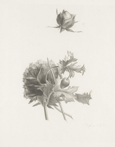 Editor: Here we have "Rozen," a print made between 1820 and 1833, currently held at the Rijksmuseum. It's quite delicate, almost like a pressed flower meticulously preserved. What first strikes you when looking at it? Curator: The symbolism inherent in floral depictions always fascinates me. In this engraving, observe the rose itself. It's never simply about the beauty of nature. The rose has long been tied to ideas of love, secrecy, and sometimes even death. Editor: Death? That’s interesting. It feels more romantic than morbid at first glance. Curator: Consider the wilting quality hinted at within the blooms and stems. The petals begin to fade. What might that imply about the nature of beauty and its temporal qualities? How does this compare with the concept of 'memento mori' we see elsewhere? Editor: So, it’s about more than just pretty roses. It’s about the fleeting nature of beauty and maybe a quiet acknowledgement of mortality. Does the artist’s choice of engraving have any bearing on that symbolism? Curator: Absolutely. Engraving allows for precise detail, almost scientific observation, which gives these images a quality of realism – perhaps hinting at a ‘truth’ within the beauty, or indeed a darker truth beneath. It mimics a preserved specimen, like an entomologist's pinned butterfly, which could evoke thoughts about a bygone era or tradition. Editor: That connection makes a lot of sense. I never would have thought to associate those deeper meanings with an image that seems, at first, purely decorative. Curator: The cultural memory associated with certain images runs deeper than just the surface. This piece really prompts us to see beneath initial impressions. Editor: Right. Looking at "Rozen" now, it's far more complex than a simple depiction of flowers; it's a meditation on time, beauty, and impermanence.