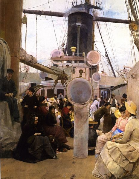 Editor: So, this is "The Ball on Shipboard," painted by James Tissot in 1874. It's oil on canvas, and the thing that strikes me is the overwhelming sense of social stratification; it feels so rigid and performative. What's your take? Curator: You’ve picked up on something crucial: performance. Consider the historical context – post Franco-Prussian War France, a society grappling with immense social upheaval and anxieties around class, national identity, and even gender roles. These anxieties surface through Tissot’s keen eye. The meticulously rendered clothing, the careful posing... how does this "performance" of the upper class intersect with broader socio-political forces? Editor: I guess they are performing a return to normalcy or even stability amidst all this turmoil? Curator: Precisely! Look at the flags. What nations are represented, and what might their presence suggest about international relations and France’s position in the world at the time? Also, notice how some figures appear marginalized or isolated despite being physically present at this "ball". It makes you wonder: who truly belongs, and who is simply performing belonging? What statement, then, is Tissot making? Editor: So, it’s not just a snapshot of a social event but more like a commentary on the illusions of power and belonging during that period? A subtle criticism, maybe? Curator: Exactly. It invites us to interrogate those illusions and consider the power dynamics at play. It also invites discussions about similar “performances” and divisions we still witness today. How much has truly changed, do you think? Editor: Wow, I definitely see the painting in a different light now. I was so focused on the surface that I missed the deeper layers of social commentary. Curator: It's a potent reminder that art serves not only as a mirror to society, but also as a catalyst for critical self-reflection. I have never looked at it that way! Thanks.