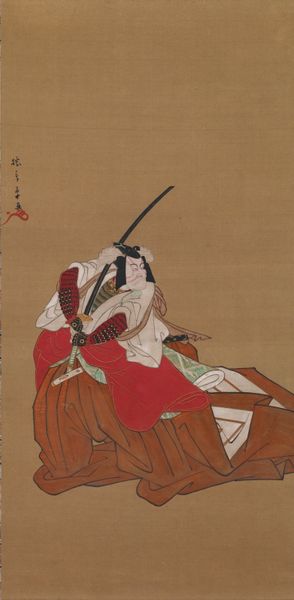 Curator: Today we're looking at "Momotarō," a woodblock print crafted by Katsukawa Shuntei in 1821. What strikes you first about this Ukiyo-e work? Editor: There's a certain somber stillness despite the seemingly celebratory elements. The lone figure, seated with that striking text on his kimono...it's heavy, yet refined. Is that a lobster in the background? Curator: Indeed. Let's break down the composition. Shuntei utilizes bold lines and flat planes of color characteristic of Ukiyo-e. Observe how the artist renders form—minimal shading, prioritizing outline and pattern. Notice the considered arrangement of the figure and the prop. The sword's angle, the deliberate placement of the offering... it all guides the eye. Editor: I can't help but consider the symbolic weight of that so-called 'offering.' Lobster often represents longevity and good fortune, but within the context of Momotarō, Japan’s peach boy folk hero, I read defiance, and an indictment of power structures, as well. Momotarō challenges demons—figures who can embody social oppressions, imperial overreach. It prompts one to ask what "fortune" truly means in this fraught political landscape. Curator: An astute interpretation. Still, look at how the white characters contrast with the darker fabric of his garment, creating a compelling graphic element. It’s not just symbolic—it's visually arresting, a prime example of Japanese printmaking’s clever use of color and form. The curve of the sword mirrors that of the lobster’s body—notice how those curves converge. Editor: Form serves meaning. Momotarō's story itself challenges tradition. He springs from a peach, defying conventional birth narratives. In that kimono and sword, this hero’s narrative is intertwined with resistance and demands not only a visual assessment but an analysis of its sociocultural influences and commentary. Curator: It speaks to the power of formal composition shaping how we read the themes. Editor: Agreed. The genius is indeed, how interwoven art is, with intention.
