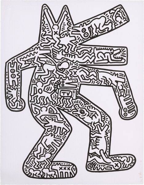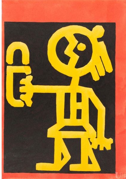 Editor: So, this is Fernand Léger's drawing, "The Album 'Circus'," from 1950. It has a rather light-hearted and playful feel to it with these bold, simple lines. It feels quite modern even now. What symbols or hidden meanings do you find in a seemingly simple line drawing like this? Curator: Well, I find a connection to traditional iconography through its stark visual language. Notice the figure's deconstructed form, especially the hands, they hold the essence of gesture and presentation like a Byzantine icon presents the Holy Family. The circus, too, isn't just about entertainment, it's a space of transgression and altered realities, like religious ritual. Don't you find that the abstracted form compels our own interpretation, our own 'filling in the blanks,' much like how generations interpret and reinterpret sacred images? Editor: That's fascinating! I hadn’t thought of it like that. So you are saying the reduction to basic shapes allows us to project our own understanding of, in this case, the circus, onto the artwork? Curator: Precisely. Consider the hat. It suggests a performer, a role. But what *kind* of performer? Are they hiding behind the mask or presenting a genuine aspect of themself? These objects trigger a flood of cultural associations, but their abstraction ensures no single interpretation dominates, encouraging the viewer to be a participant. The artist uses a sort of ‘everyman’ figure here, making them universal through shape, gesture, and colour alone. What do *you* read into the cartoon-like approach? Editor: I see now. It simplifies, like a folk tale or children's story, making the message more accessible. So it is about simplifying form to amplify universal symbolism? Curator: Exactly! We simplify to connect to a larger story. We both tapped into those memories when thinking about what this figure represented and, crucially, *means*.