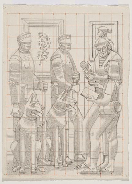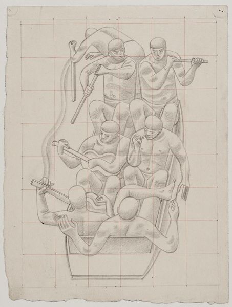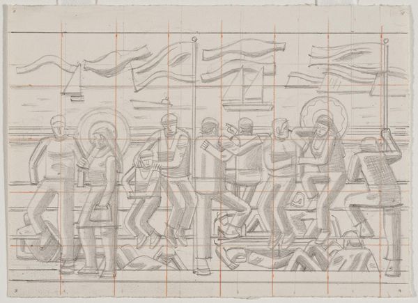 Editor: Here we have William Roberts's Study for 'The Drums', a pencil drawing. It's fascinating to see the artist's process with the grid lines still visible. What strikes me is the almost classical feel of the figures despite their rather modern clothing. How do you interpret this work? Curator: Well, looking at this study, I’m drawn to Roberts's engagement with both tradition and the modern socio-political currents of his time. Notice how the figures, though rendered in a somewhat geometric style influenced by Vorticism, are posed in a manner reminiscent of classical friezes. Considering Roberts's background and the period in which he worked, how do you think the inclusion of drums might be read in the context of post-war Britain and its relationship to ideas of empire and otherness? Editor: That's a great point. It makes me think about cultural appropriation and the way non-Western cultures were often exoticized. Curator: Precisely. Understanding the politics of imagery in Roberts's time allows us to consider the complex ways in which artists negotiated issues of representation and power.