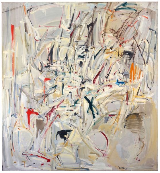 Curator: Up next we have "La Chatiere" painted by Joan Mitchell in 1960, a key example of Abstract Expressionism from her vibrant period in France. Editor: It feels both chaotic and tightly controlled. There’s a sense of raw energy emanating from that central cluster of color, almost threatening to burst apart, yet somehow the composition holds. Curator: Mitchell was working within the established language of Abstract Expressionism, but pushing against it too. In that historical context, New York was seen as the undisputed center, yet here she is, an American in France, contributing a distinctive voice to the movement. Editor: Yes, look at how she orchestrates that network of lines. There is a certain weight assigned to color to create both dynamism and depth, while the drips and splatters are deliberately positioned—it's a conversation of intentionality and chance. Curator: It's worth noting the social life of the painting, its status. "La Chatiere" shows Mitchell, a female artist, striving for and achieving the scale of artistic recognition afforded her male counterparts like de Kooning and Pollock. These canvases become spaces of claiming. Editor: You're right, it has ambition in its size, but consider her use of layering: each stroke and blot builds a complex tapestry where certain shapes disappear into and emerge from this complex pictorial architecture. Note also that intense field of black against areas of exposed primed canvas, such a vital contrast of dark and light. Curator: "La Chatiere," as with so many abstract works of this era, allows audiences a different form of connection. Rather than depict the external world it strives to capture emotions. In viewing this painting, consider that period's sociopolitical environment -the height of the Cold War, a time of societal change and unease that many artists strived to process. Editor: This piece demands our focus, our active viewing to make sense of how it exists as an emotional artifact. Every element carries such intentional visual meaning and has great significance to our aesthetic response. Curator: Understanding Mitchell's ambition and context enhances our experience and appreciation for this work, while we both have brought our expertise, hopefully that in turn allows you a more engaged look. Editor: Ultimately, “La Chatiere" provides so many avenues of aesthetic investigation and such dynamism within its materiality, line and light.