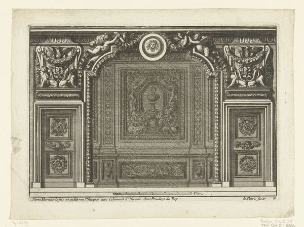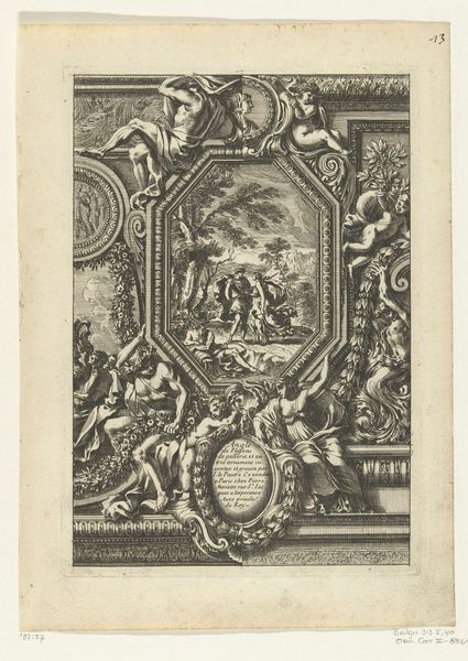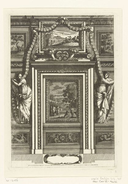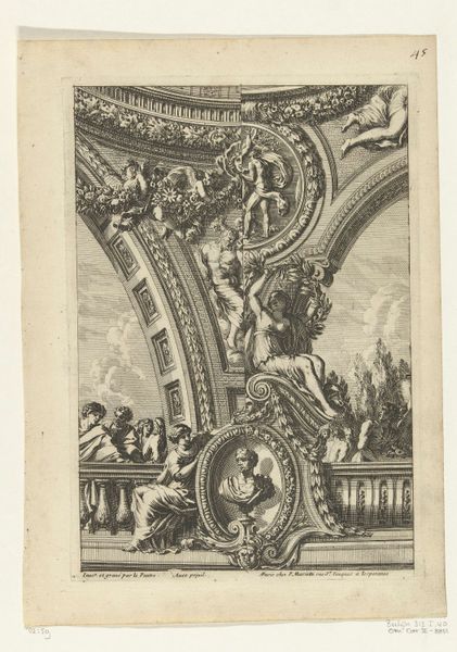 This print, titled "Kwart plafond," meaning "Quarter Ceiling" in Dutch, was made by an anonymous artist. The medium is etching, a printmaking technique with a long history. The image presents a section of an ornate ceiling, teeming with classical motifs: figures, floral garlands, and geometric panels. These details aren't just drawn; they are the product of a highly skilled hand, manipulating metal with acid and ink. The process demands precision and control, each line carefully considered. But beyond the aesthetic, we should consider the social context. Etchings like these were often made to disseminate designs, acting as pattern books for artisans and builders. This particular print, therefore, hints at a world of skilled labor, of plasterers, painters, and sculptors translating these two-dimensional designs into elaborate three-dimensional spaces. It is a document of taste, labor, and the aspiration to classical ideals, all intertwined.