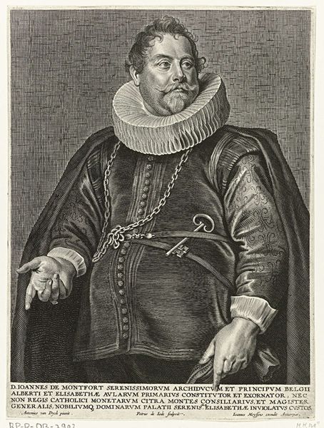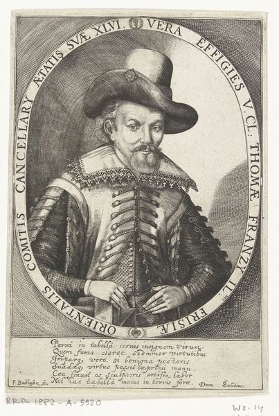 Curator: We are standing before "Portret van Willem van Nieulandt (II)," an engraving produced in 1662 by Joannes Meyssens, currently held at the Rijksmuseum. It exemplifies the Dutch Golden Age portrait style. Editor: My first impression is of restrained elegance. There is an undeniable sense of character conveyed through the lines; it feels like peering into the past. Curator: Absolutely. Considering Meyssens's work within the Baroque period, we find a fascination with capturing the essence of the individual and exploring identity. Think about the cultural impact on portraiture, given this image exists as a readily reproducible print. The work’s dissemination facilitated the concept of celebrity during this period. Editor: The man's wide-brimmed hat and lace collar communicate an air of self-assurance, yet I am intrigued by the artist's intentional use of shadow around his eyes—an intimation of underlying melancholy or deep contemplation? I wonder if this speaks to a broader understanding of Willem as a figure and artist. Curator: That observation touches on an intersection of personal and political expression. Willem van Nieulandt himself was a painter, so one might interpret that hand gesture, which falls roughly near his sternum, as symbolic, gesturing at the seat of intellect, inspiration and drive. Furthermore, this was produced amidst a rapidly shifting political climate within the Dutch Republic, reflecting its emerging global power and complex internal social stratification. Editor: This visual encoding reflects the socio-economic changes in Northern Europe; these symbolic depictions create meaning by embodying ideas from shared cultural memory. I see visual metaphors pointing at the era’s ideals of artistic skill, and ambition. Curator: Considering the societal factors at play, it seems essential that the subject is positioned in such a powerful fashion. Editor: This portrait is compelling in its quietness, a meditation on self and identity. The iconography prompts a journey of thought through history, psychology and artistry, long after one walks away from it.