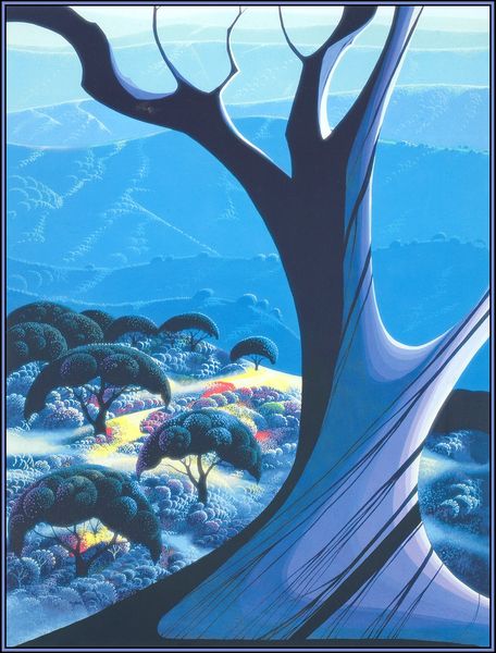 Eyvind Earle made this painting, Blue Pine, with what looks like smooth, controlled brushstrokes and a deep, saturated palette. The texture here is all about the surface, which is slick, and kind of dreamlike. It’s almost as if the tree is glowing from within. Look at the way he uses blue: it’s not just one blue, but a whole range, from the darkest indigo in the shadows to the bright, almost electric blues that highlight the edges of the trunk. The light feels like it’s coming from everywhere and nowhere at once. The trunk is built from dark shadows with thin white highlights which give it depth but are also obviously stylized. Earle’s pine reminds me of Klimt’s decorative landscapes or maybe even some of those early modernist set designs. It’s a painting that’s not afraid to be beautiful, and in its own way, that's pretty radical.