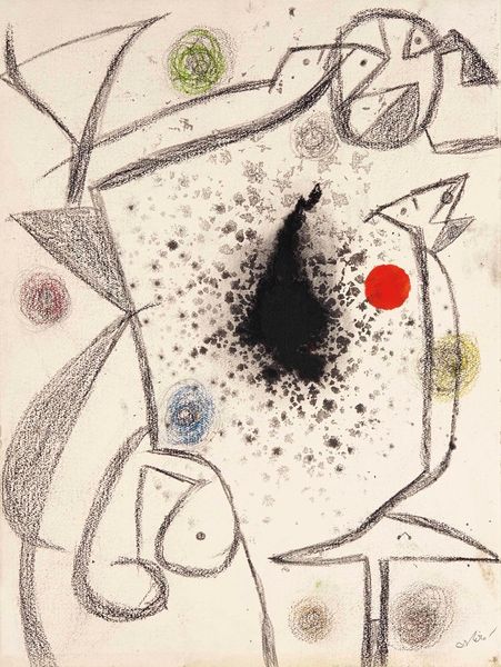 Curator: Immediately I see playful chaos—it's like looking into a vibrant, imaginative world. The shapes feel like they're dancing on the canvas, yet grounded. Editor: Here we have Joan Miró’s "L’astre du marécage," or "The Star of the Marsh," a mixed-media collage and ink work dating to 1967. Note how the spattered ink lends texture, contrasting with smoother applications of paint and collaged elements. Curator: Yes! The splatters remind me of the night sky… almost like accidental constellations. And the earthy colors offset by brighter accents give it this dreamlike, almost surreal quality. It's amazing how something so abstract can still feel deeply rooted. I like that very much about Miró. Editor: Exactly! The composition, although seemingly random, adheres to an underlying structure. Circles echo throughout, creating visual harmony and drawing the eye. The stark contrasts—the dark, almost earthy blacks and grays against vivid reds, greens, blues and yellows—heighten the overall impact. It is also significant that the constellation-like spattering is visually opposed by those grounded, blob-like figures—these are not stars or astral projections; this artwork is "terrestrial." Curator: Terrestrial but maybe still reaching for the stars? There’s this…long, elongated shape across the middle with curved ends; It kind of suggests this earthly grounded creature reaching out. Editor: Or perhaps constrained by that very nature. Miró was exploring subconscious thoughts and emotional states at this point. The stark symbols and simplified forms become vehicles to communicate those subconscious desires, which are bound in any number of ways. Curator: And even today, don’t we do the same with our quick sketches? Capture something fleeting and precious? "The Star of the Marsh" seems to remind us that we’re all just scribbling our little dreams and desires into the vast unknown. And how gorgeous it is, really, even in its roughness. Editor: Precisely, by combining these elements, the cosmic with the mundane, Miró elevates our earthly experiences, urging viewers to rediscover the profound beauty in simplicity, even amidst life's swampiest moments.