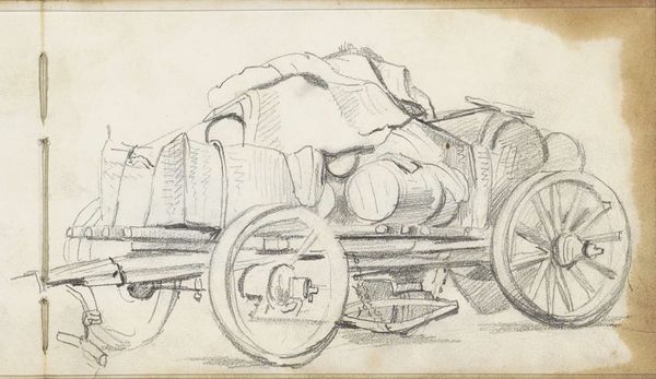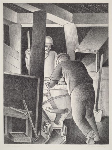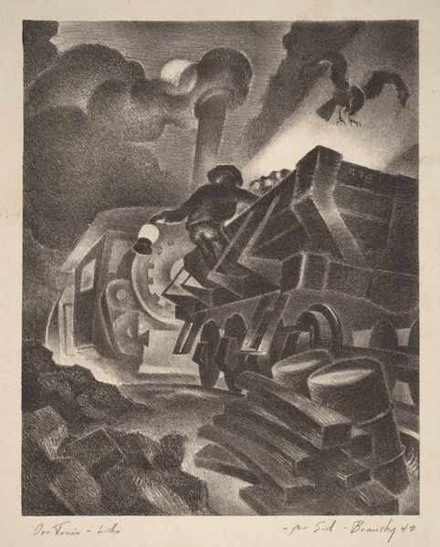 Editor: Coreen Mary Spellman's "U.S. Car Owners," made around 1945 using pencil and printmaking, really struck me with its almost humorous depiction of labor. The awkward posture of the figure wrestling with the enormous tire creates a definite mood. How do you interpret this work? Curator: This piece resonates with the post-war American psyche, particularly anxieties about modernity and individual reliance on machinery. Notice how the car, an emergent symbol of freedom and success, is rendered almost monstrous in scale compared to the human figure. This is a distortion reflecting psychological unease; is the car owning the man, rather than the other way around? The exaggerated size and shadows invoke the weight of industrial advancement, and perhaps its potential to overwhelm the individual spirit. Editor: That's a perspective I hadn't considered. I focused more on the literal image, but thinking of it symbolically, the tire almost becomes an oppressive force. The tool laying abandoned nearby strengthens the feeling of struggle and futility. Curator: Exactly! And Spellman, in her role as a woman artist during this period, presents an interesting commentary on masculinity. This almost comical, exaggerated struggle might even critique idealized images of male capability, highlighting a kind of everyman's frustrating encounter with technological dependence. Does this added layer of meaning change your first reaction at all? Editor: Definitely. It went from a funny scene to a surprisingly potent visual statement on post-war American identity. It’s amazing how much deeper the work gets by considering its symbolism. Curator: Precisely, the symbols accumulate to create something deeply evocative, revealing the layers of meaning beneath the surface of the everyday.
