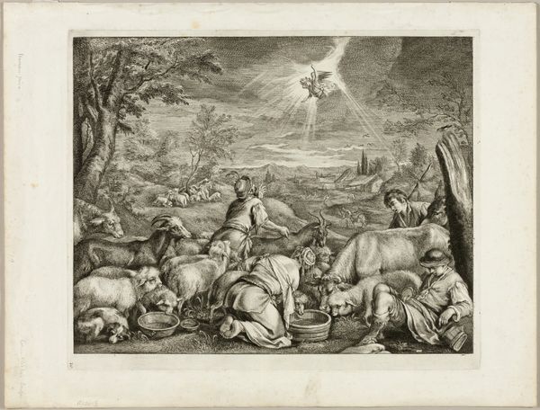Curator: This is "The Separation of the Sheep from the Goats" by Adriaen Collaert, who lived from 1560 to 1618. It’s currently housed at the Harvard Art Museums. Editor: It's a pretty dramatic scene, with those contrasting skies, isn’t it? A real visual depiction of judgment, and not very subtle! Curator: Absolutely. Consider the historical context: the Counter-Reformation heavily influenced art. This piece, likely intended for a religious text, is deeply didactic. Editor: How interesting. To me, it raises questions about power, who decides who is a sheep or a goat, and how that impacts identity and belonging. Curator: Precisely. It's a potent reminder of how artistic representation can reinforce societal norms and moral judgments. Editor: Seeing it through that lens makes me wonder who the "sheep" and "goats" would be today, and how those labels are still used. Curator: A chilling, yet vital, question to keep in mind. Editor: A lasting image, then, beyond its historical roots.