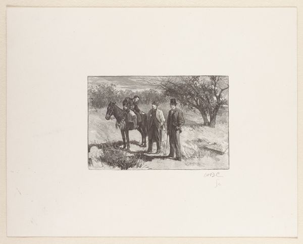 Curator: This drawing by Karl Meunier, created between 1874 and 1894, is called “Ten Miners on Their Way to Work.” It seems simple, rendered in graphite or pencil, but the mood is rather powerful, don’t you think? Editor: Absolutely, the greyscale palette lends it a very somber, heavy feeling. And there's an emphasis on the bodies—are those clogs they're wearing? You can almost hear the trudging. I’d guess that's a print of some kind—look at the uniformity of the line. Curator: Indeed. It's fascinating how Meunier evokes such physicality using seemingly minimal means. Their stooped postures, the weariness in their steps... it's incredibly evocative. Each man appears locked in his own world, despite their collective journey. Makes you think, what burdens are they carrying beyond their physical labor? Editor: Right. Think of the socio-economic pressures too; the conditions that bind these men together, forcing them into the mines day after day. We see the same type of subject echoed across Europe in paintings by people like Courbet or Millet. Here it’s reduced, distilled to its material essence – a group of workers, delineated with sparse but powerful lines. I find that really intriguing. Curator: It becomes almost symbolic, doesn't it? Their faces are obscured, nearly indistinguishable, representing a shared plight. What’s impressive is Meunier's capacity to expose humanity under duress. It goes beyond simple representation. Editor: Definitely. The choice of materials plays a big role too – pencil, graphite and printmaking; a seemingly ‘humble’ set of choices that gives form to this vision. He doesn't need to be flashy, it isn’t trying to be part of any artifice or the salon. It emphasizes, instead, something vital, raw. And their placement low in the composition? Subordinates them—brilliant! Curator: So, we have a work crafted with relatively simple media, carrying an emotional charge and potent social undertones. Remarkable. Editor: Yes, that’s exactly it, a work that reminds us that art is as much about the how and the why as it is about the what. A study of labor made of labor!